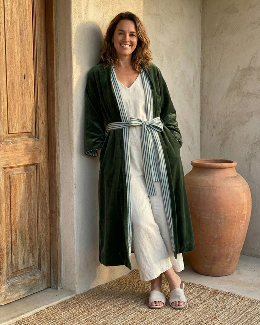 Eucalypt Mallee Velvet Kimono Coat - Reverse Dabu Cotton