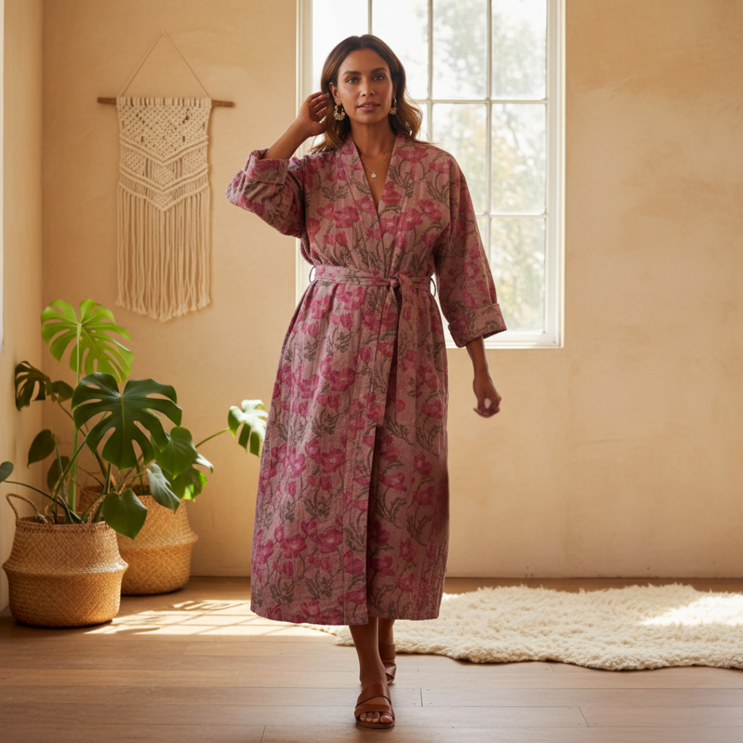 Each Sāmsarā Kimono is slow-made by skilled artisans who carefully repurpose discarded fabric remnants. Thoughtful craftsmanship ensures that every piece carries its own unique character while embracing sustainability at every step. Naturally overdyed in earthy tones, the kimono embodies the beauty of renewal and mindful creation.
