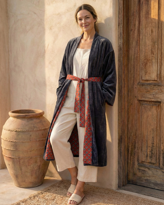 I love this❤️ I wish that the sash had been velvet rather than the lining fabric, However, Everything Else is Perfect. Weight, quality, pockets, reversable, comfort, colour and contrast. A beautiful garment that has years of wearable life.