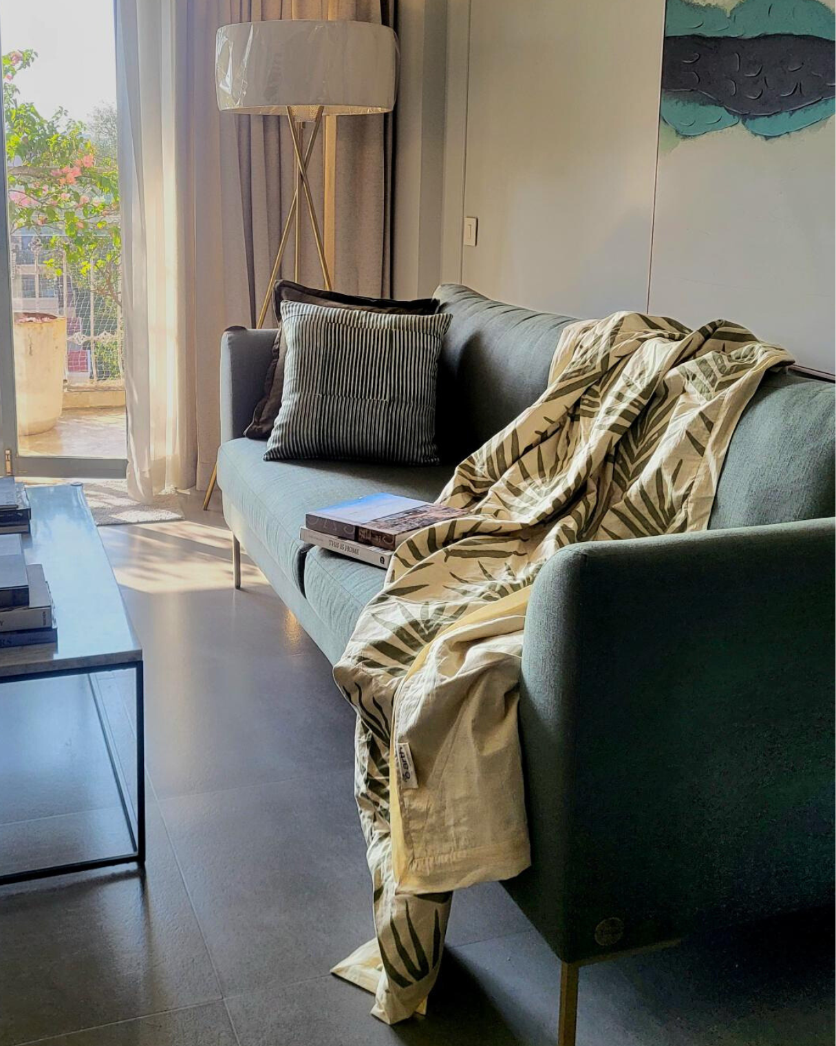 Bangalow Throw in EucalyptusIn the heart of the city, where life moves fast, our Organic cotton throw slows things down. Draped casually over a modern sofa, it brings a touch of nature indoors: soft, grounding, and quietly stylish. As seen in an apartment in Glebe - perfect for those golden hours when the light spills in and the world feels still.