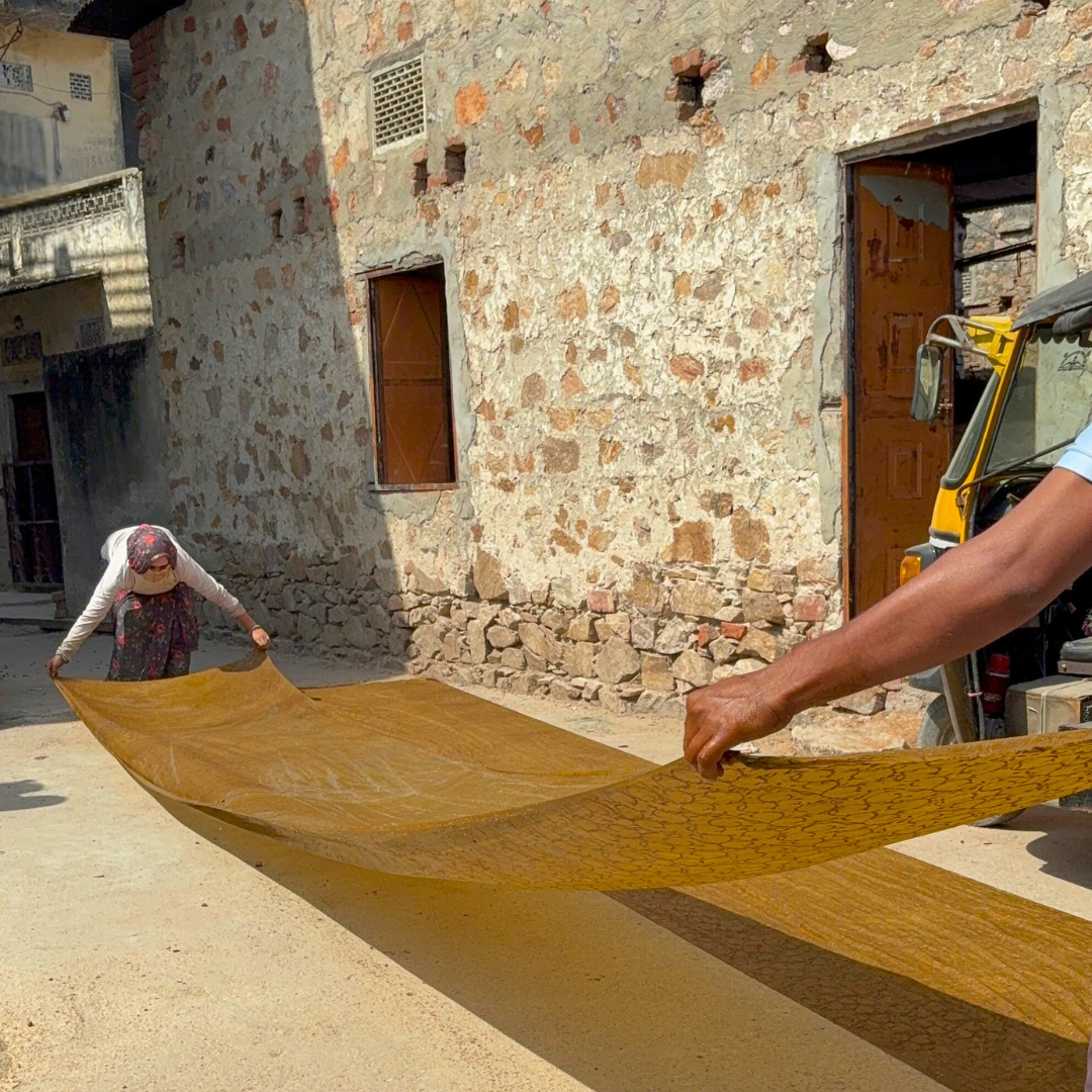 ‘Dabu’ Mud Resist Print: The reverse side features a unique Dabu mud resist print in complementary earthen tones. This ancient Indian technique creates organic patterns with a hand-crafted feel, adding a touch of artisanal charm