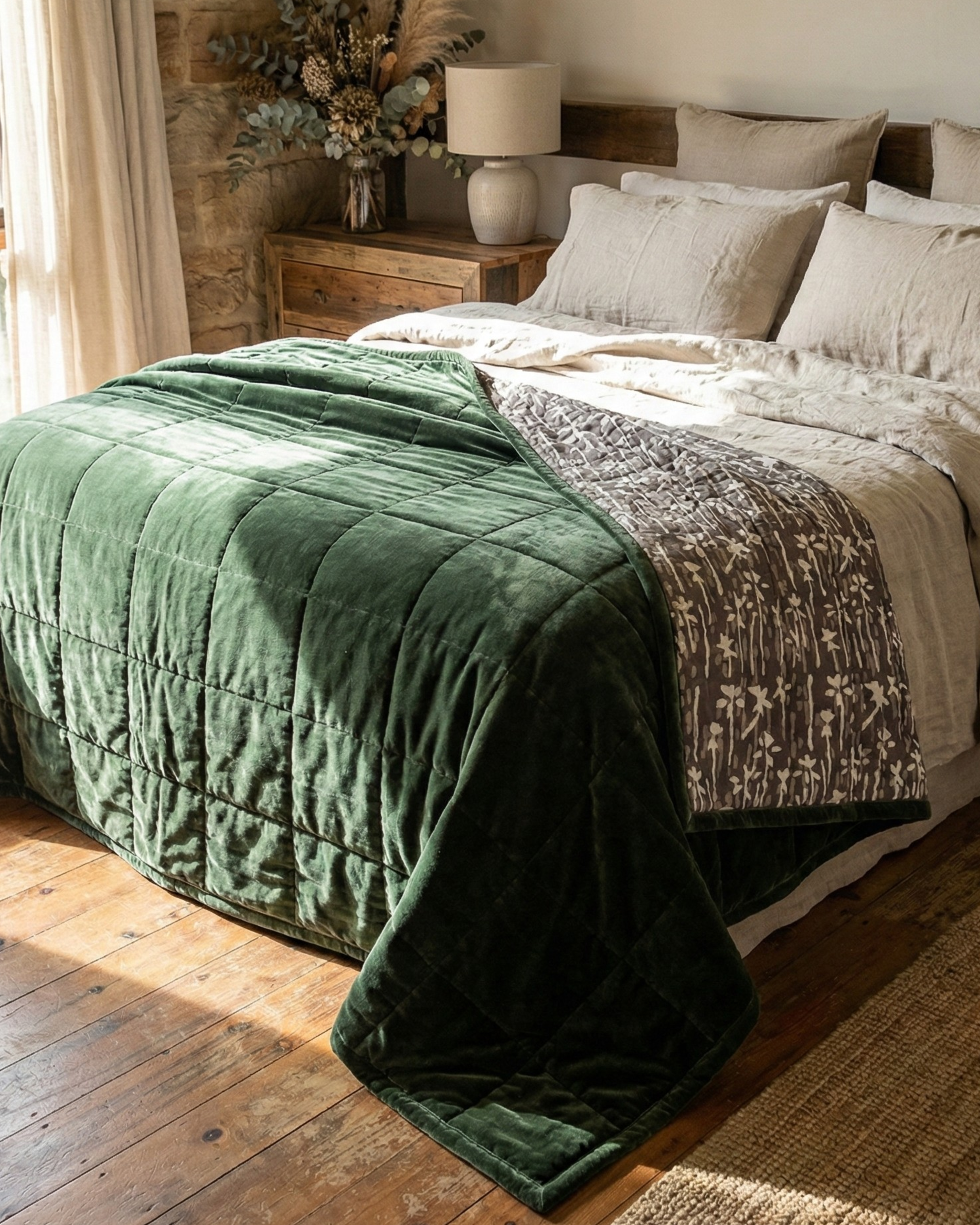 The quilt is crafted from 100% cotton velvet, offering a sumptuously soft and inviting texture.