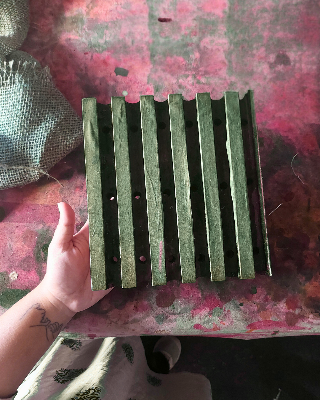 The green reverse side complements the striped pattern, adding a touch of earthy elegance.
