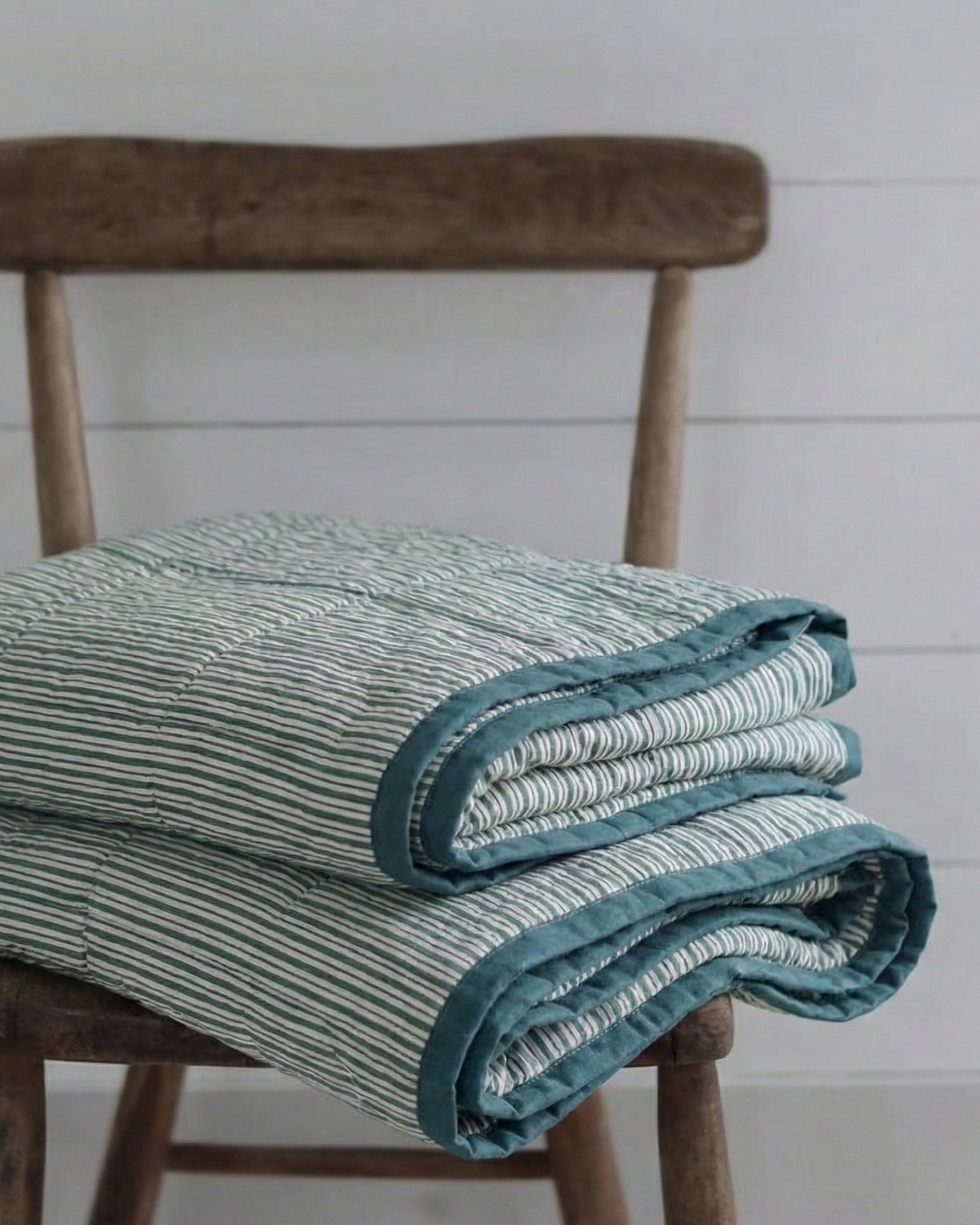 The hand kantha quilting enhances the throw's tactile appeal and showcases the artisan craftsmanship.