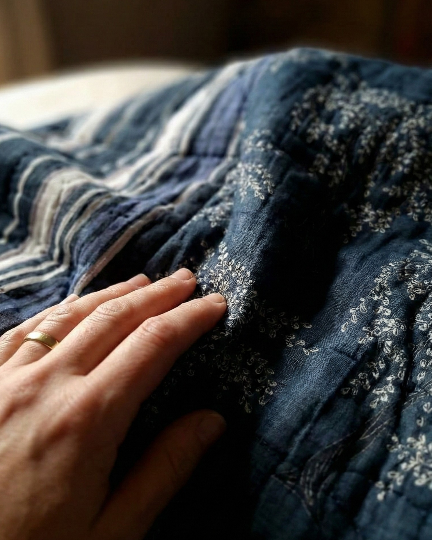 Artisan's Note: Each Ode Tree Throw and Quilt is crafted from soft cotton voile, layered with natural cotton fill, and hand quilted in Kantha. Every running stitch guided slowly by hand. The gentle variations in spacing and rhythm are the mark of the maker, giving each piece its own character. Available in Midnight, Khakee Teal, and Ochre.