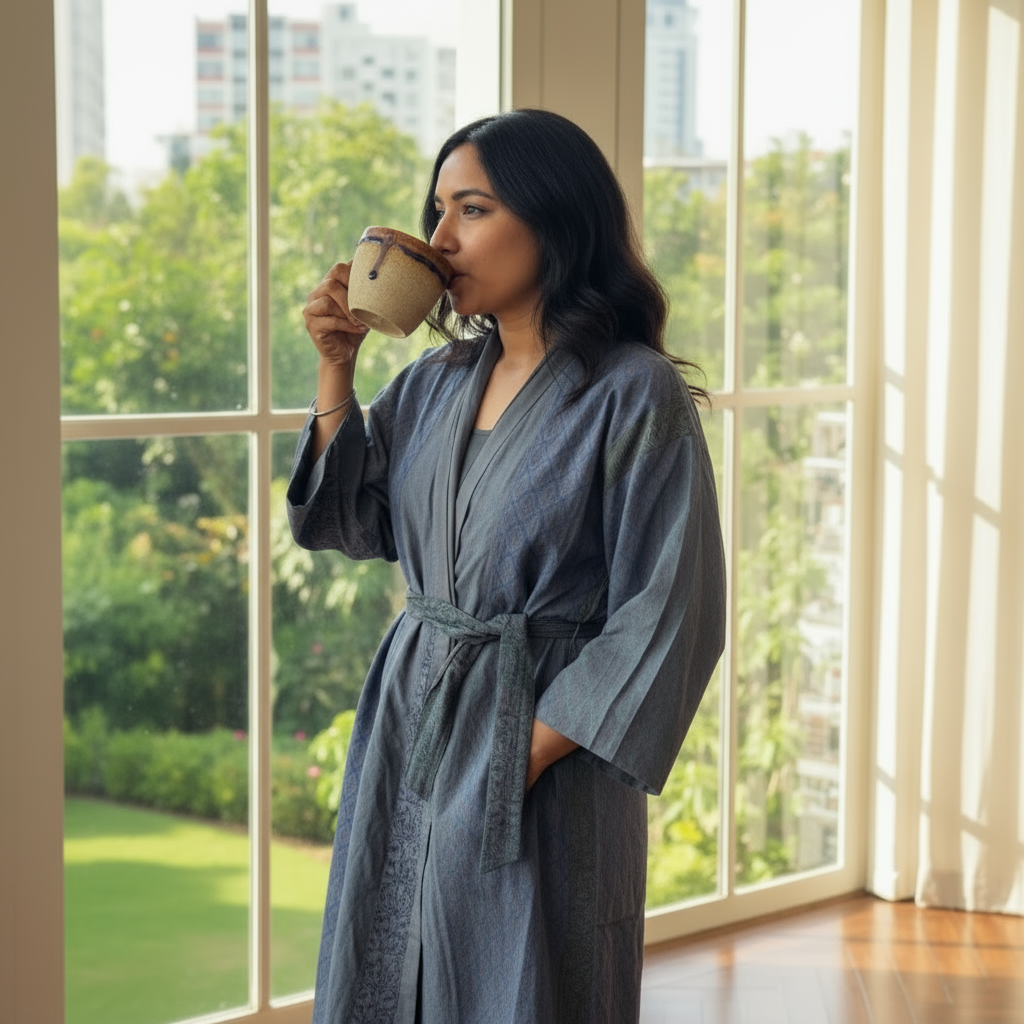 Each Sāmsarā Kimono is slow-made by skilled artisans who carefully repurpose discarded fabric remnants. Thoughtful craftsmanship ensures that every piece carries its own unique character while embracing sustainability at every step. Naturally overdyed in earthy tones, the kimono embodies the beauty of renewal and mindful creation.