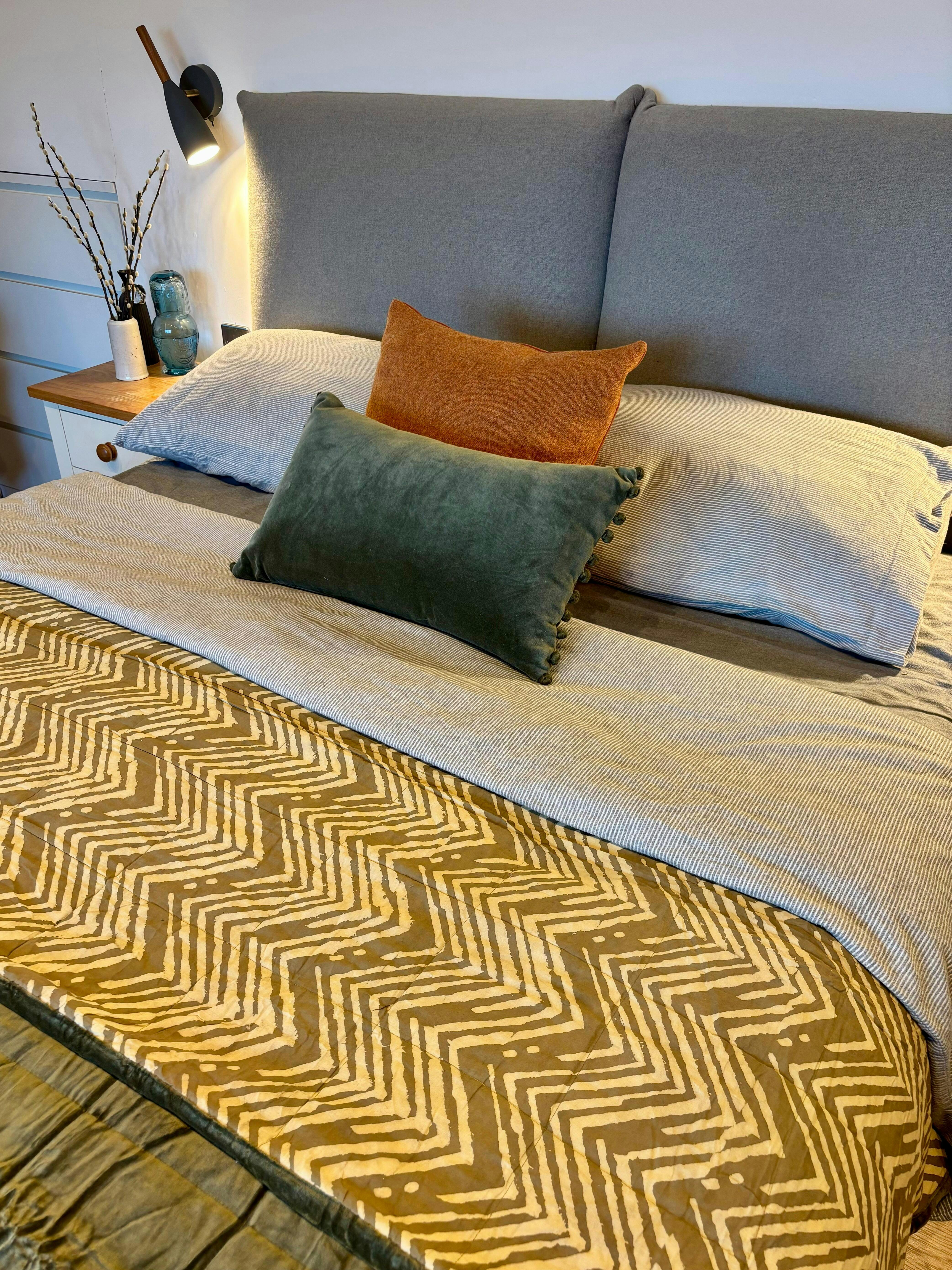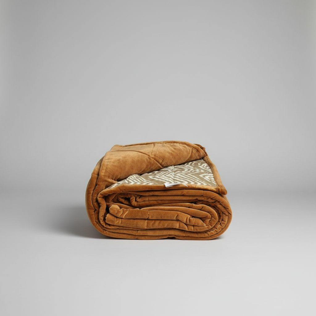 This is a piece that combines the plushness of cotton velvet with the artisanal charm of ‘Dabu’ mud resist printing. This quilt brings a touch of natural elegance and luxurious comfort to your home.