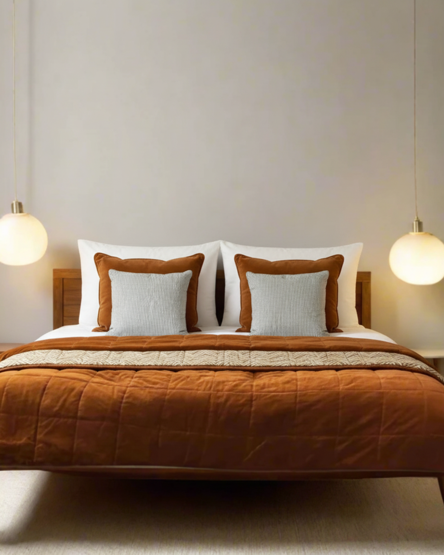 The quilt is crafted from 100% cotton velvet, offering a sumptuously soft and inviting texture.