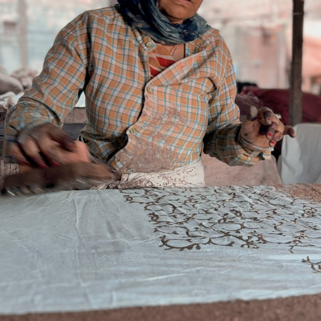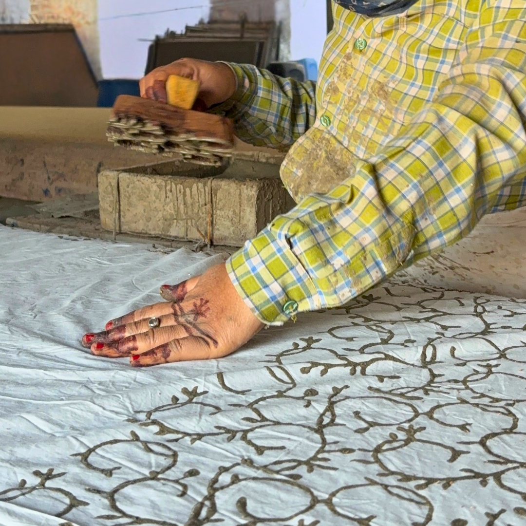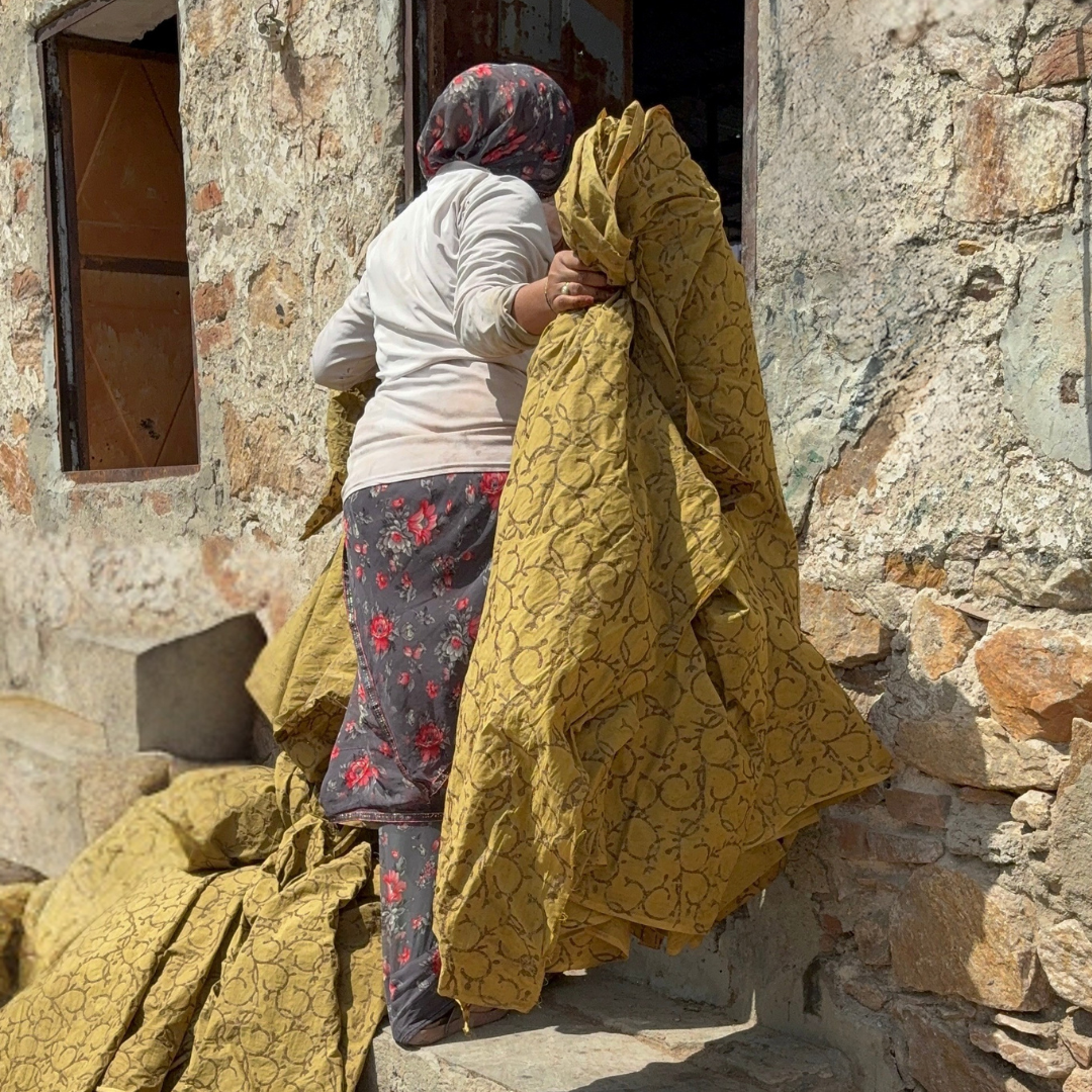 ‘Dabu’ Mud Resist Print: The reverse side features a unique Dabu mud resist print in complementary earthen tones. This ancient Indian technique creates organic patterns with a hand-crafted feel, adding a touch of artisanal charm